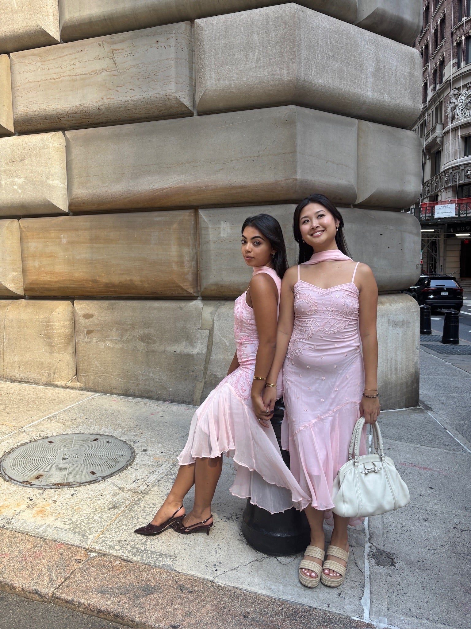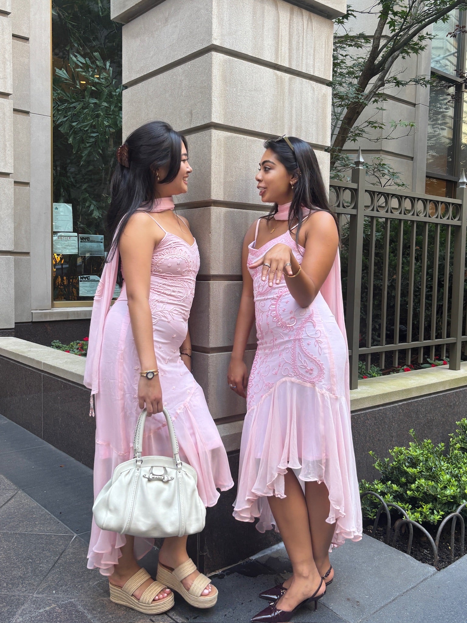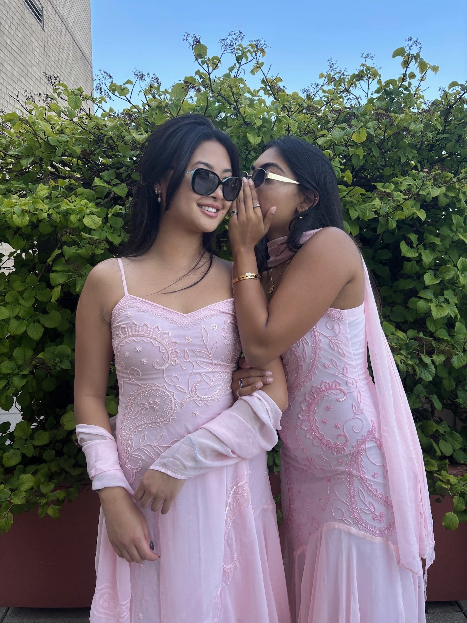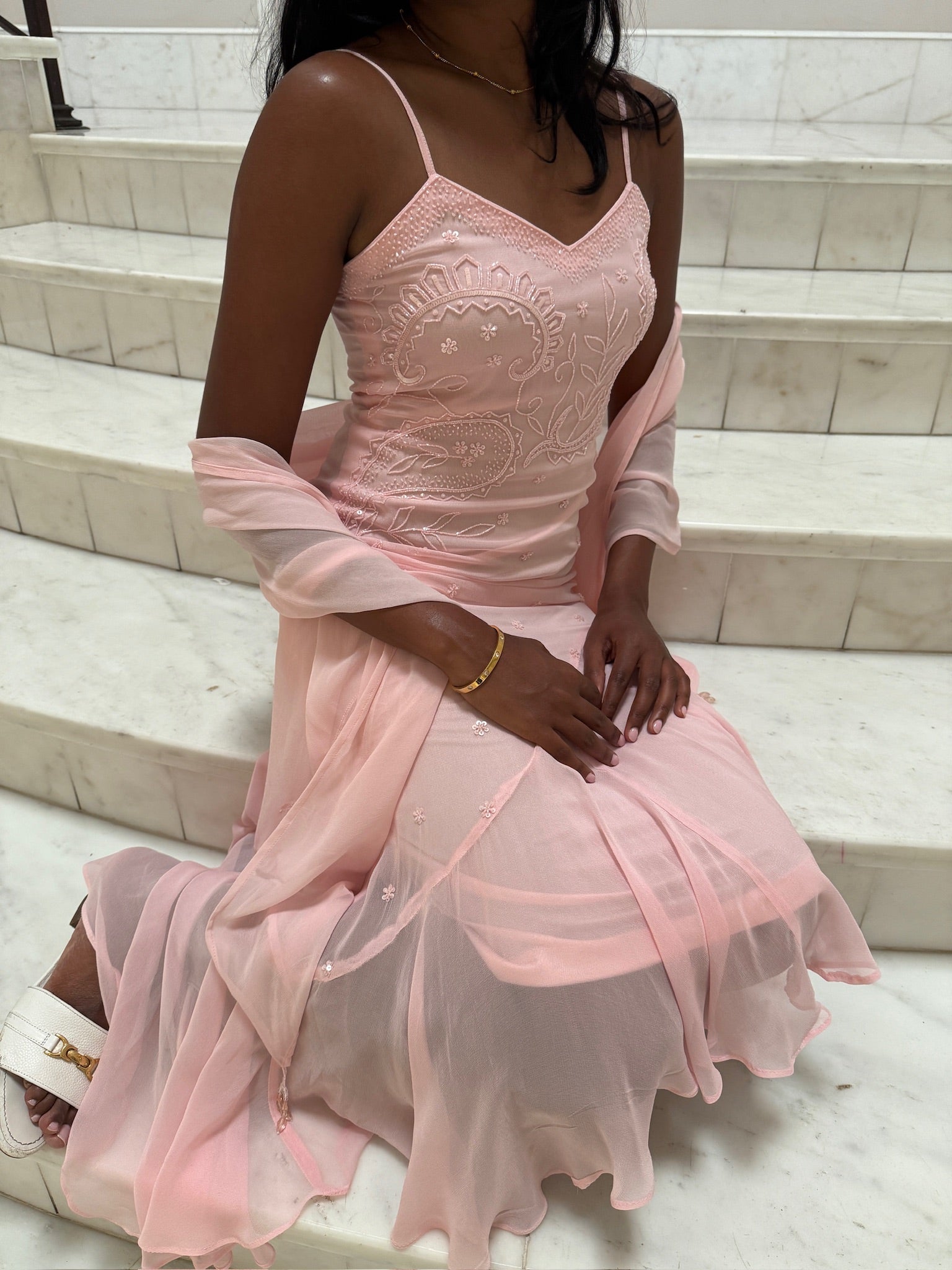 Description: Our viral Anjali dress is handcrafted by skilled artisans in India and features intricate beadwork and delicate embroidery. It blends elements of South Asian craftsmanship, like draping inspired by sarees, with a modern Western silhouette. The matching beaded scarf (chunni) is included and can be worn multiple ways - drape it over your shoulders, around your neck, or wrap it.